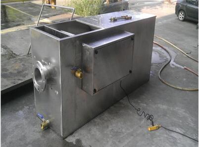廚房隔油器是采用自然上浮法將油水分離,以達(dá)到去除廚房間洗滌污水中的可浮油。廚房烹好洗滌污水通過地面明溝或地下管道,從設(shè)備的一端流入同同鋼絲的油水分離接受箱,污水中較大固體顆粒在此截留,而后污水通過廚房隔油器的二個分離區(qū)進(jìn)行油水分離。在流的過程中,由于流速降低,粒徑較大及比重小于1的油品雜質(zhì)上浮到水面上,而水從設(shè)備另一端的排水管流走。